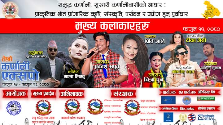 सुर्खेत । वीरेन्द्रनगर सुर्खेतमा जारी तेस्रो कर्णाली एक्सपोको पाचौं दिन शनिबार चर्चित कलाकार प्रकाश सपुत लगाएतका कलाकारहरुको प्रस्तुुति रहने आयोजकले जनाएको छ ।